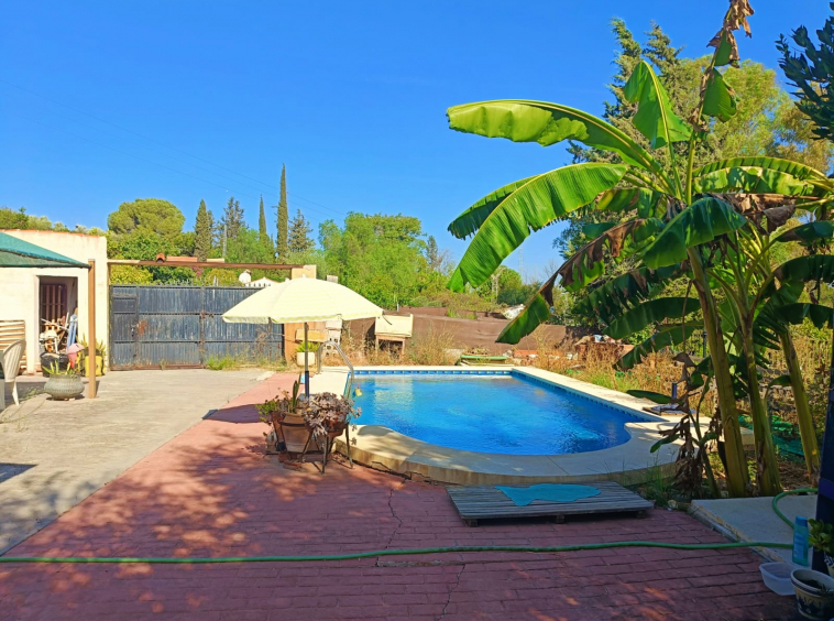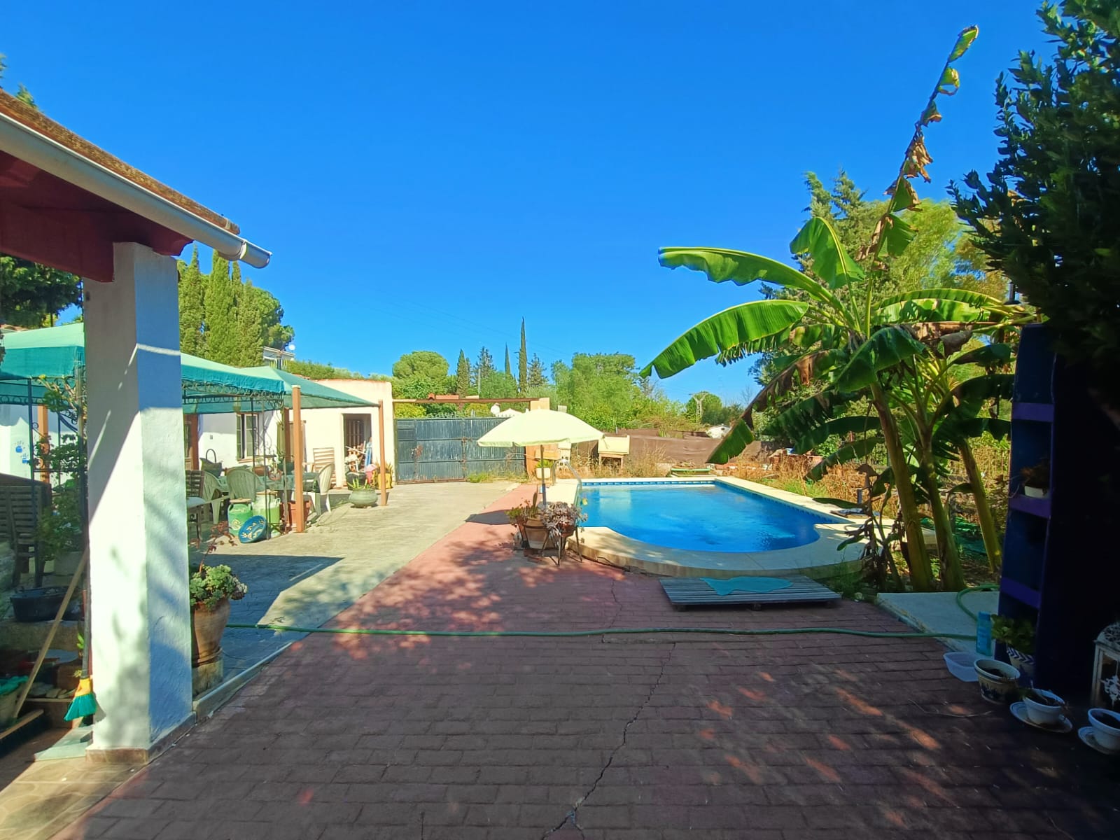 Entrando por el portón principal nos encontramos con la vivienda principal de frente y una bonita piscina rodeada de vegetación lo que la hace muy atractiva y privada.